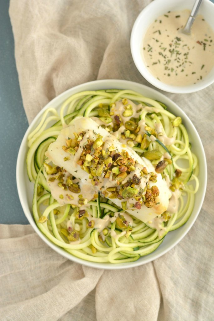 4. Place zucchini spaghetti first into a plate and add fillet on top and drizzle with roasted walnuts.